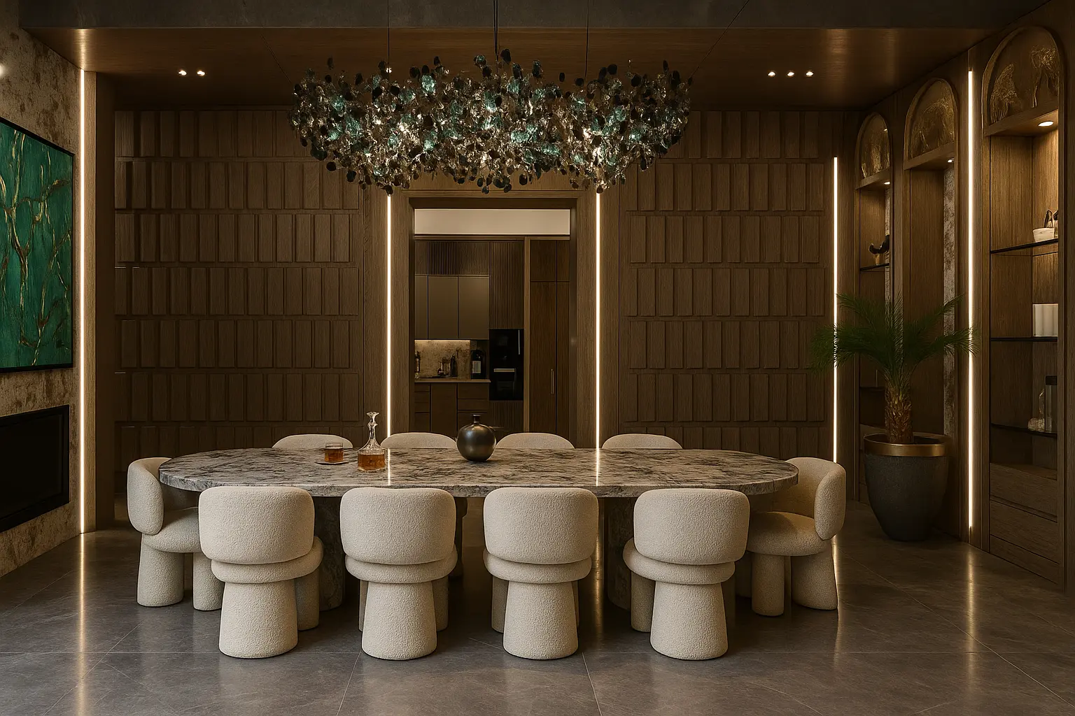 Bu tasarım örneğinde olduğu gibi, mekân planlamasında akış ve açıklık, yaşam alanlarının daha kullanışlı ve birbirine bağlı hale gelmesini sağlar. Yemek alanı, sadece masa ve sandalyeden ibaret değil; aynı zamanda ev sahipliğinde prestiji, gündelik yaşantıda ise huzuru temsil eden bir merkezdir.