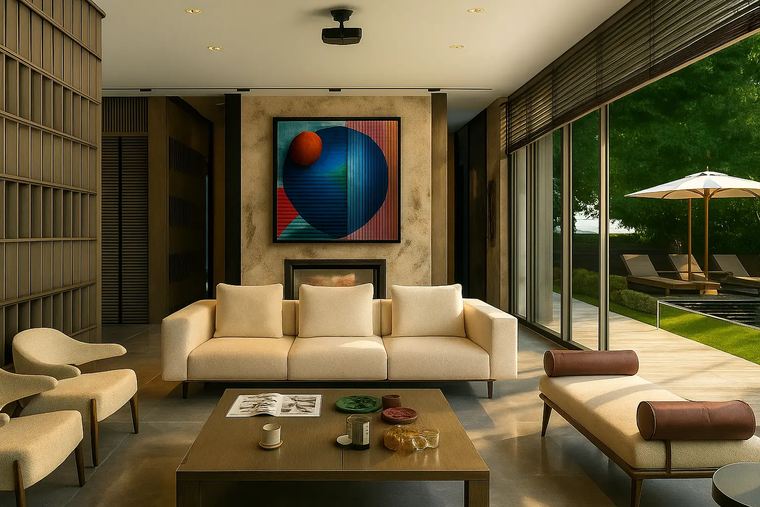 Geniş cam panellerle dış mekânla kurulan bağ, iç yaşamın doğaya açılmasını sağlar. Sanat eseriyle vurgulanan duvar yüzeyi, mekâna estetik bir odak kazandırır.
